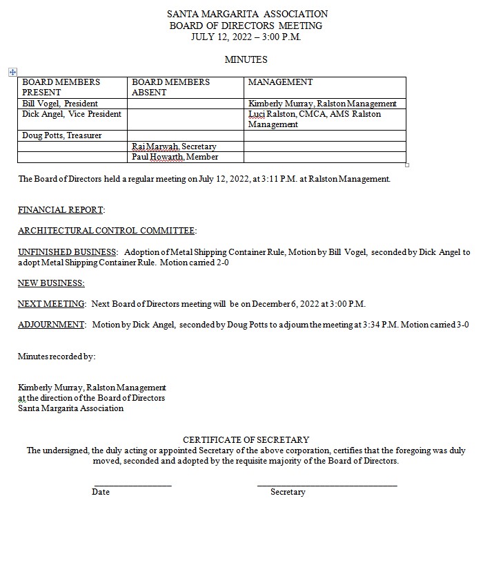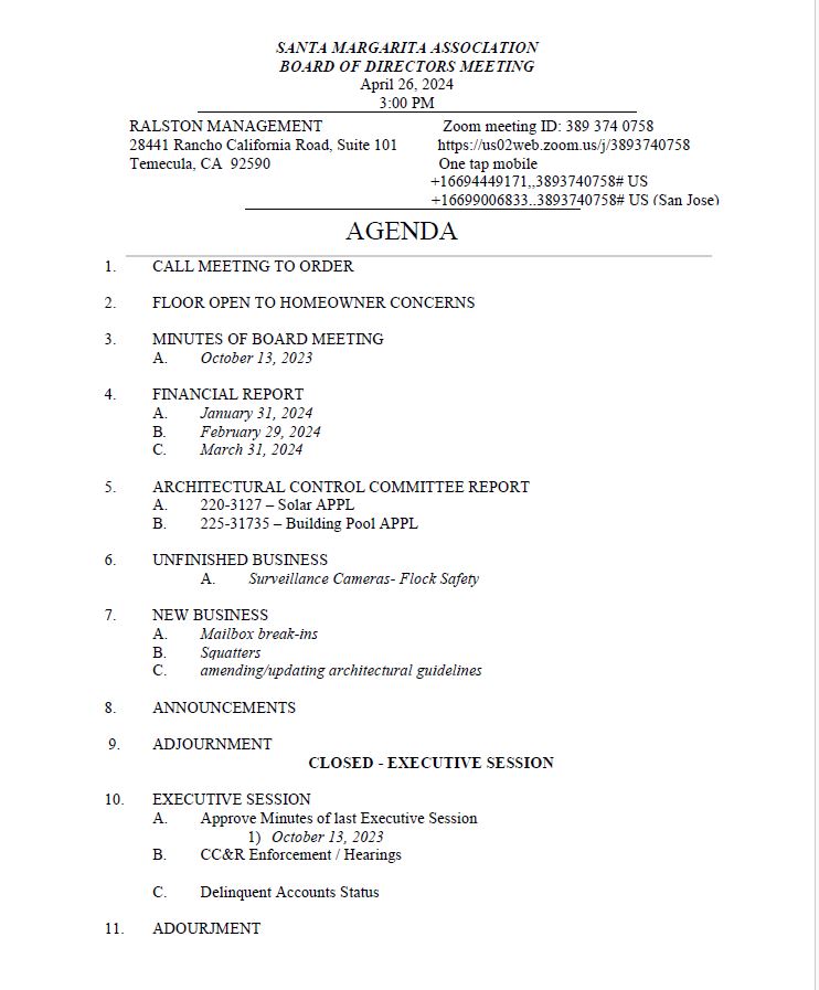 There may be an occasion when we may be required to change or cancel a meeting. Please call Ralston Management at 951-296-9030 to confirm meeting date and time.